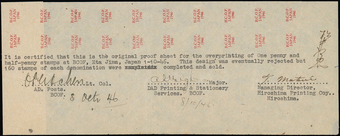 Type One (thin Overprint) on Thin Paper: Large piece (262x103mm; bottom corners clipped) from the left-hand pane with twenty impressions (2x10) - [Rows 1/10 Pos. 1-2] in red, typed "It is certified that this is the original proof sheet for the overprinting of One Penny and half-penny stamps of BCOF, Eta Jima, Japan 1-10-146. This design was eventually rejected but 160 stamps of each denomination were completed and sold", signed by Lt. Col. Fletcher, Major L. Crofts and F. Matsui Managing Director of the Hiroshima Printing Co.; light central vertical fold, fine. BW J1PP(1)B, $2,000+. Photo