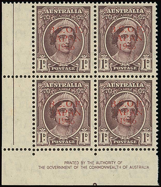 Type One (Thin Overprint) on Stamps: 1d. with overprint in red, a lower left corner block of four with imprint, fine unmounted mint. BW J2PP(2)Bz, $2,250. Photo