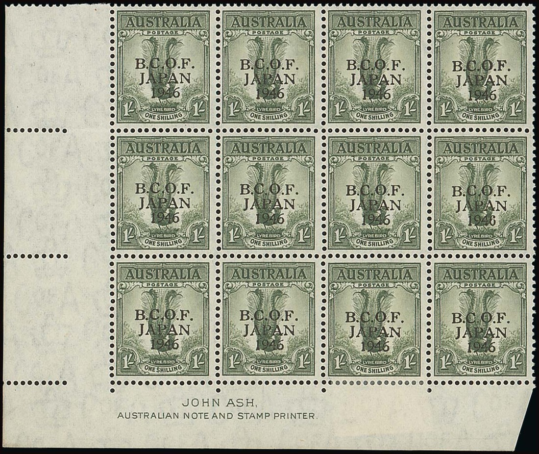 1/- grey-green lower left corner block of twelve (4x3) with imprint, one showing wrong font "6" (L9/4), mounted in the selvedge only, fine. S.G. J5/a, £570; BW J5/h, $695. Photo
