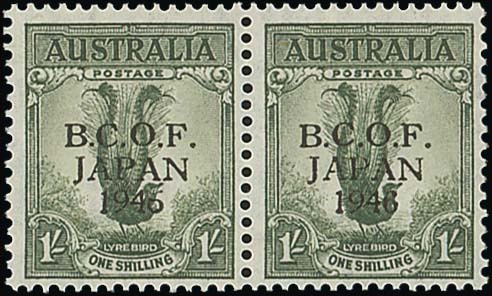 1/- grey-green horizontal pair, the right stamp showing wrong font "6" (L9/4), fine unmounted mint. S.G. J4/a, £370; BW J4/h, $495. Photo