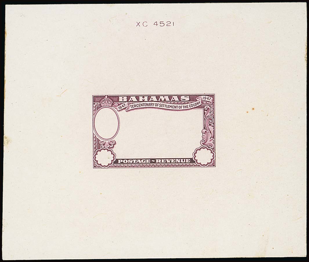 Master die proof with blank portrait, vignette and value tablets, in reddish violet on surfaced wove paper affixed to card (89x75mm), showing die number "xc 4521" at top, fine. Photo