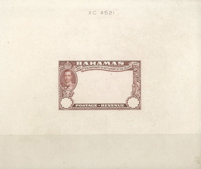 Master die proof with blank vignette and value tablets in red-brown on surfaced wove paper affixed to card (89x74mm), showing die number "xc 4521" at top, fine