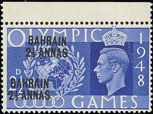 1948 Olympic Games 2½a. on 2½d. ultramarine, a top marginal example showing variety surcharge double (R.1/6), light vertical crease at right, hinged in margin only. S.G. 63a, £3,500. Photo