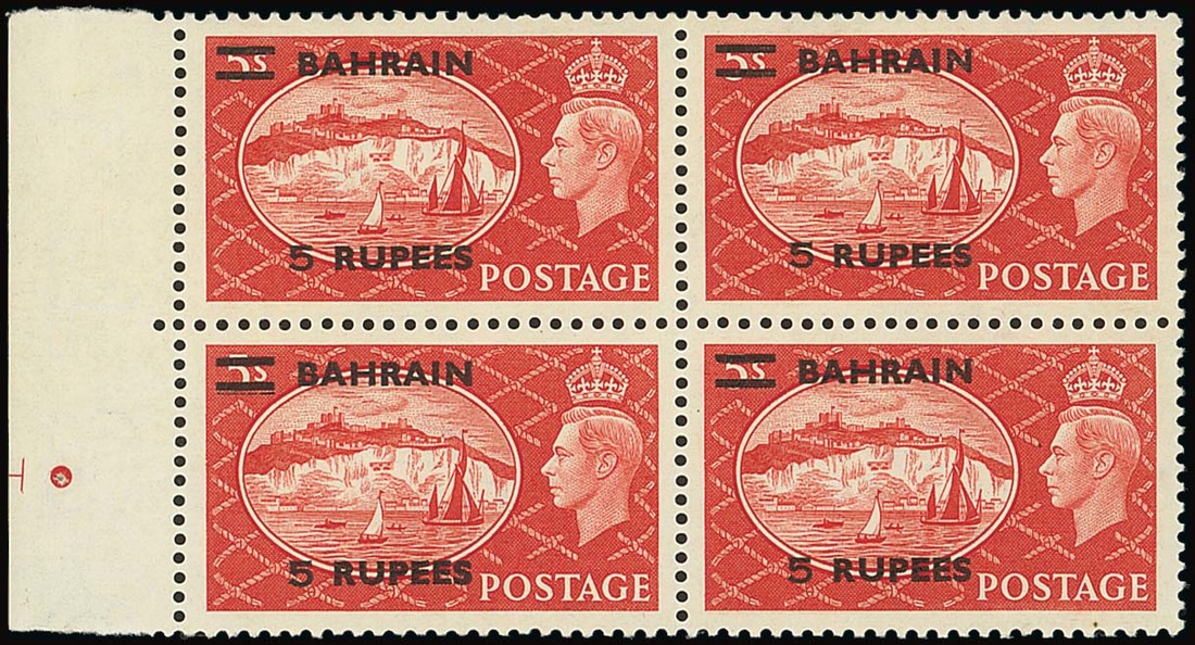 1950-55 5r. on 5/- red, a block of four with margin at left, the lower left stamp showing variety extra bar (R.6/1), fine mint, the variety with Stanley Gibbons handstamp on reverse. S.G. 78/a, £900+. Photo