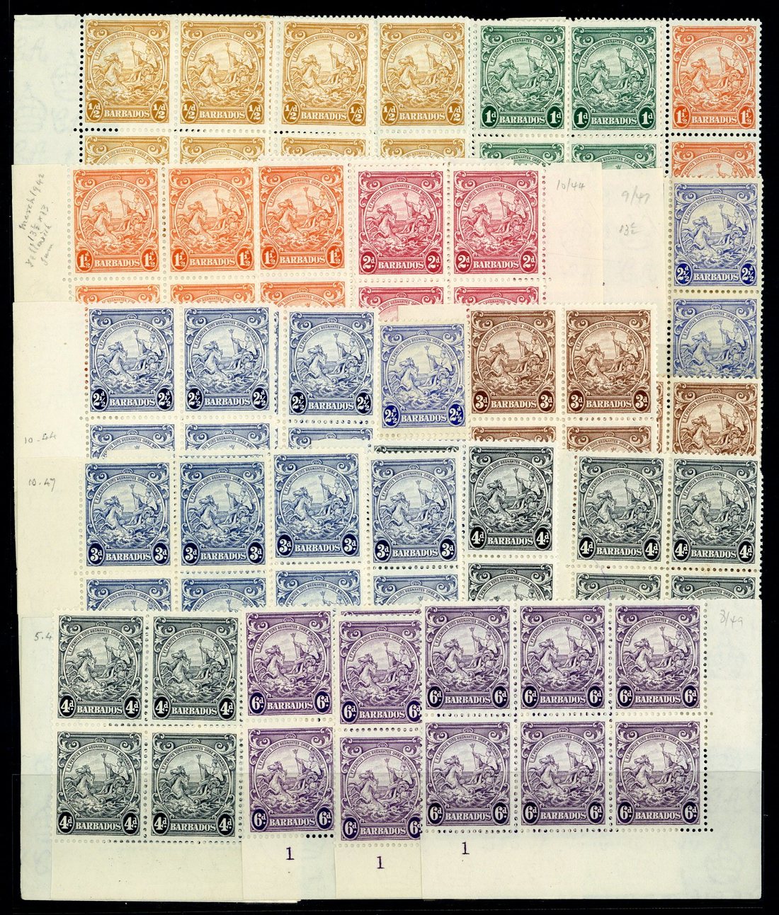 1938-47 perf 13½x13 ½d. yellow-bistre (3), 1d. blue-green (2), 1½d. (3), 2d. carmine (3), 2½d. (4, one toned), 3d. brown, 3d. blue (3), 4d. (3), 8d., 1/- (3) and 5/- corner plate number blocks of four, 6d. (3) and 2/6d. (3) corner plate number blocks of six and 2/6d. corner plate number strip of three, perf 14 ½d. green block of four, 1d. blue-green (7), 1½d. (4), 2d. carmine (7), 3d. brown (4) and 4d. (4) corner plate number blocks of four, mostly fine. Cat. £520+