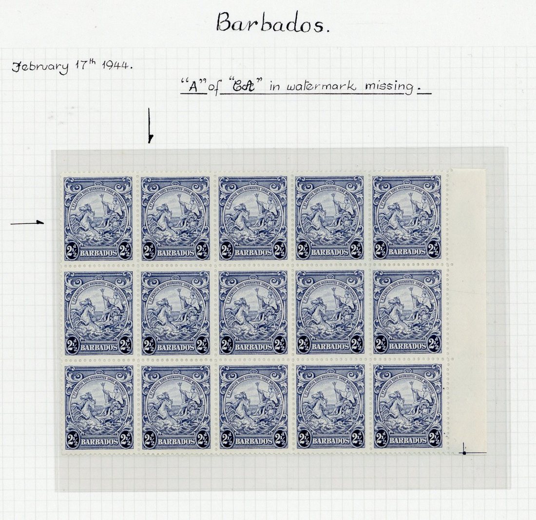 1938-47 2½d. blue block of fifteen (5x3) with margin at right, variety "a" of "ca" missing from watermark (between top left corner pair), fine unmounted mint. S.G. 251ba, £1,000