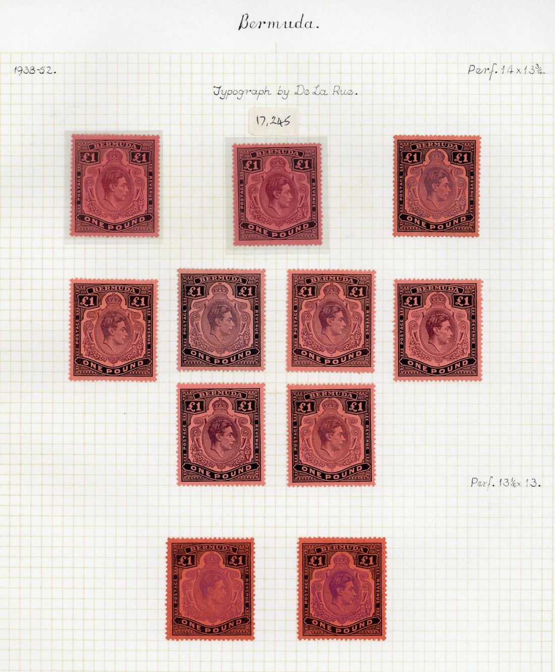 A collection on leaves with a range of shades, some identified by printing, comprising perf. 14 2/- (10), 2/6d. (5), 5/- (3), 10/- (5), 12/6d. (10) and £1 (9), perf. 14.2 line 2/-, 2/6d., 5/- and 10/-, and perf. 13 2/- (4), 2/6d. (2), 5/- (8), 10/- (2), 12/6d. (3) and £1 (2), a good representation of these interesting stamps offered together with range of ½d. to 1/- with shades and 1d. sheets (3) and a small study of the 1950 ½d. on 1d. surcharge with one sheet; generally good to fine