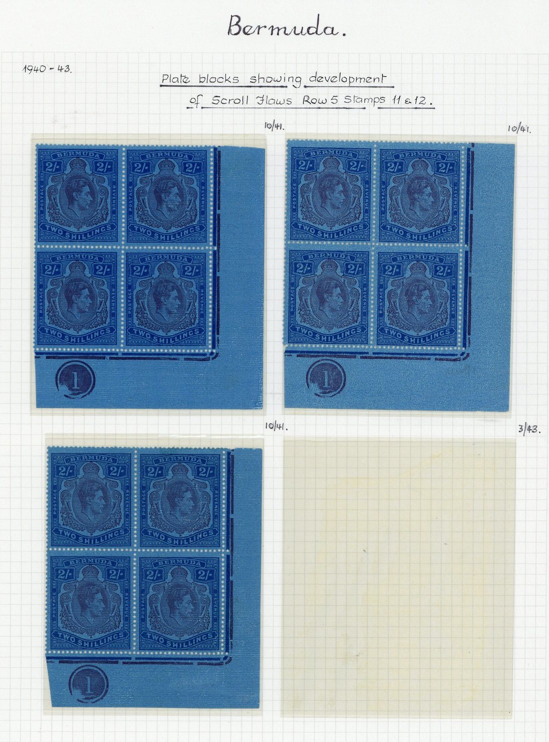 2/- purple and blue on deep blue October 1941 printing lower right corner blocks of four (3), [60] in each broken lower right scroll, slight shade variations, fine mint with two unmounted; one with crease at foot. S.G. 116/ce, £774