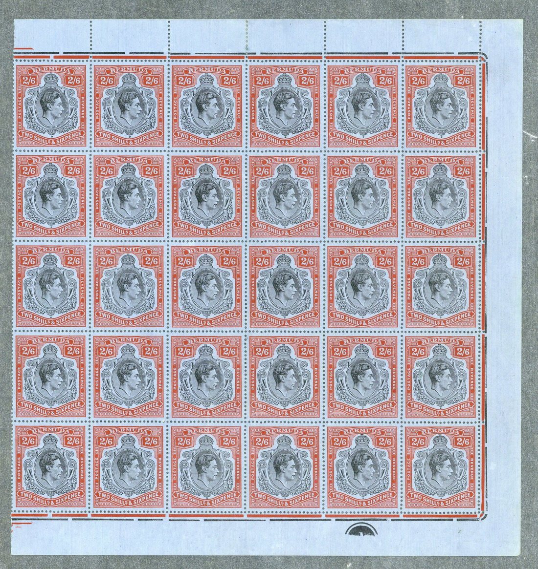 2/6d. black and red on grey-blue November 1937 printing plate block of thirty (6x5), being the complete right half of a sheet, [7-60], fresh mint with just a single hinge strengthened at top centre, otherwise unmounted mint. A scarce first printing multiple. S.G. 117, £2,100+