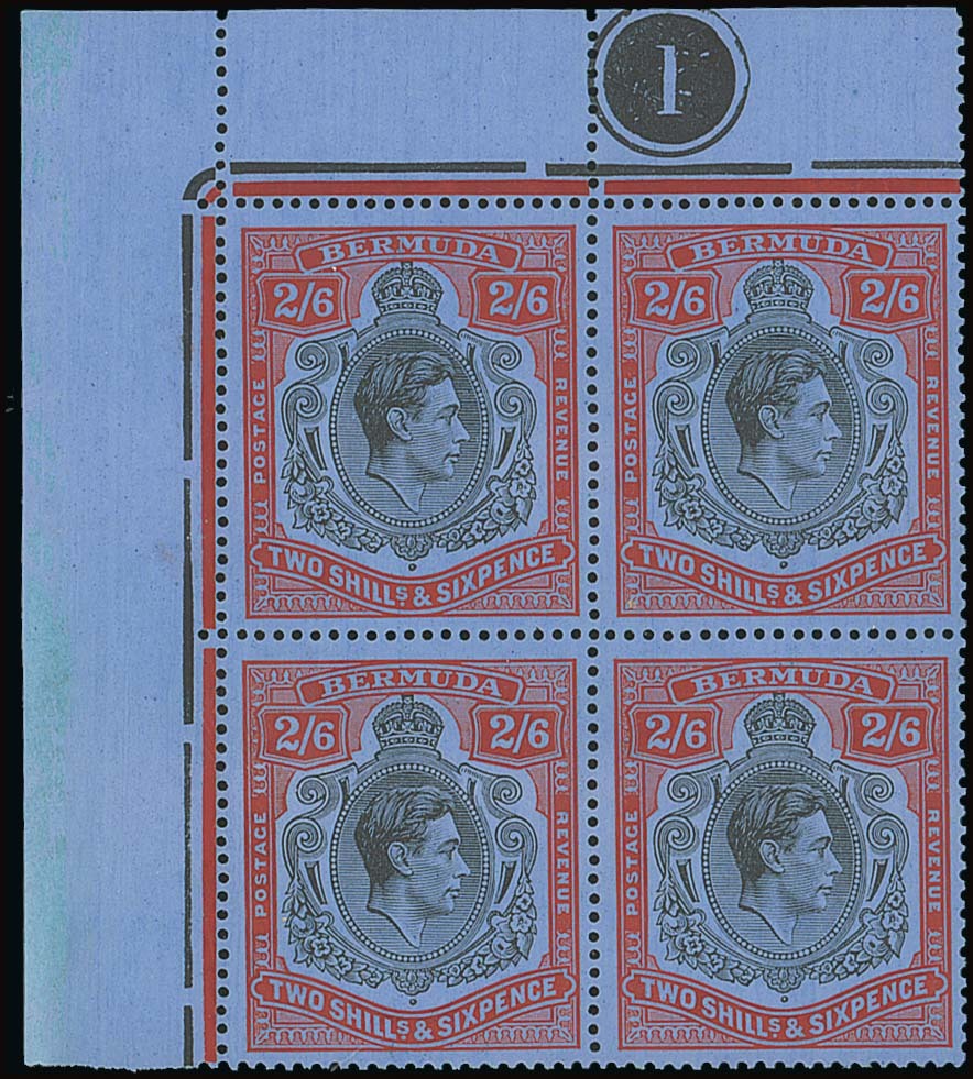 2/6d. black and red on grey-blue November 1937 printing upper left corner plate block of four, fine unmounted mint. S.G. 117. Photo