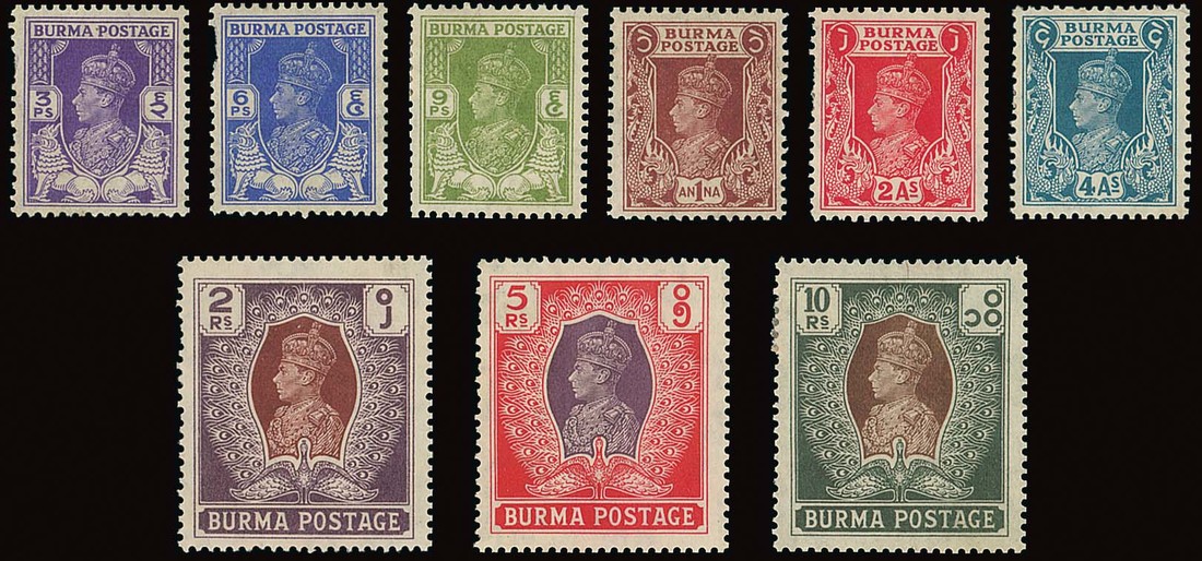 1937-38 unissued 3p., 6p., 9p., 1a., 2a., 4a., 2r., 5r. and 10r., all in the colours of the later 1938 issue, fine mint. Very rare, only twelve sets believed to exist. Photo