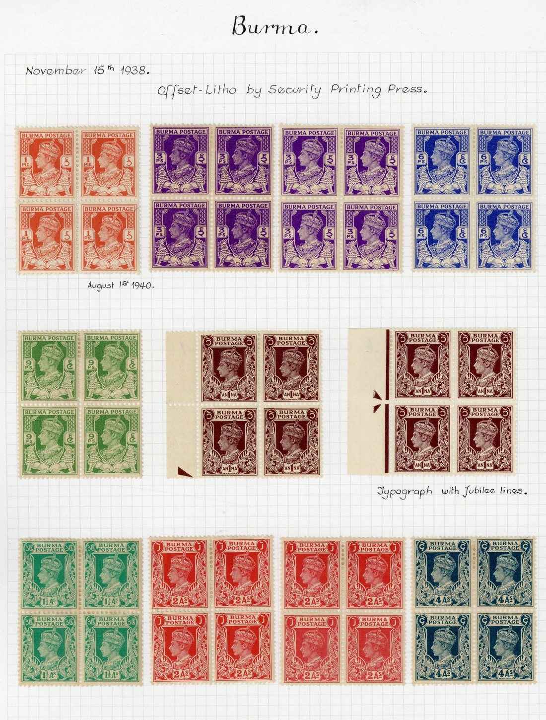 1938-40 1p. to 10r. mint study including the set in blocks of four, 1½a. with broken leaf, 2a.6p. marginal block of four with one showing birds over tree, 3a.6p. with extra trees flaw (2) and tick bird flaw (2) and 8a. with torn sail, also 1940 Centenary 1a. on 2a.6p. blocks of four (2), one with birds over trees and the other with broken bar, some tropicalisation throughout, otherwise fine. S.G. 18b-34, £2,000+