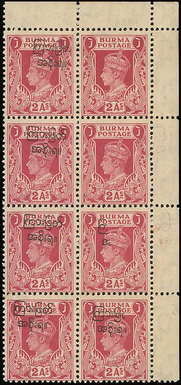 1947 Interim Government 2a. claret, a top right corner block (2x4), the top right corner vertical pair with overprint omitted and the adjacent stamp below with partial omission caused by paper fold with the overprints on reverse, fine unmounted mint. Rare. S.G.73a, £3,200+. Photo
