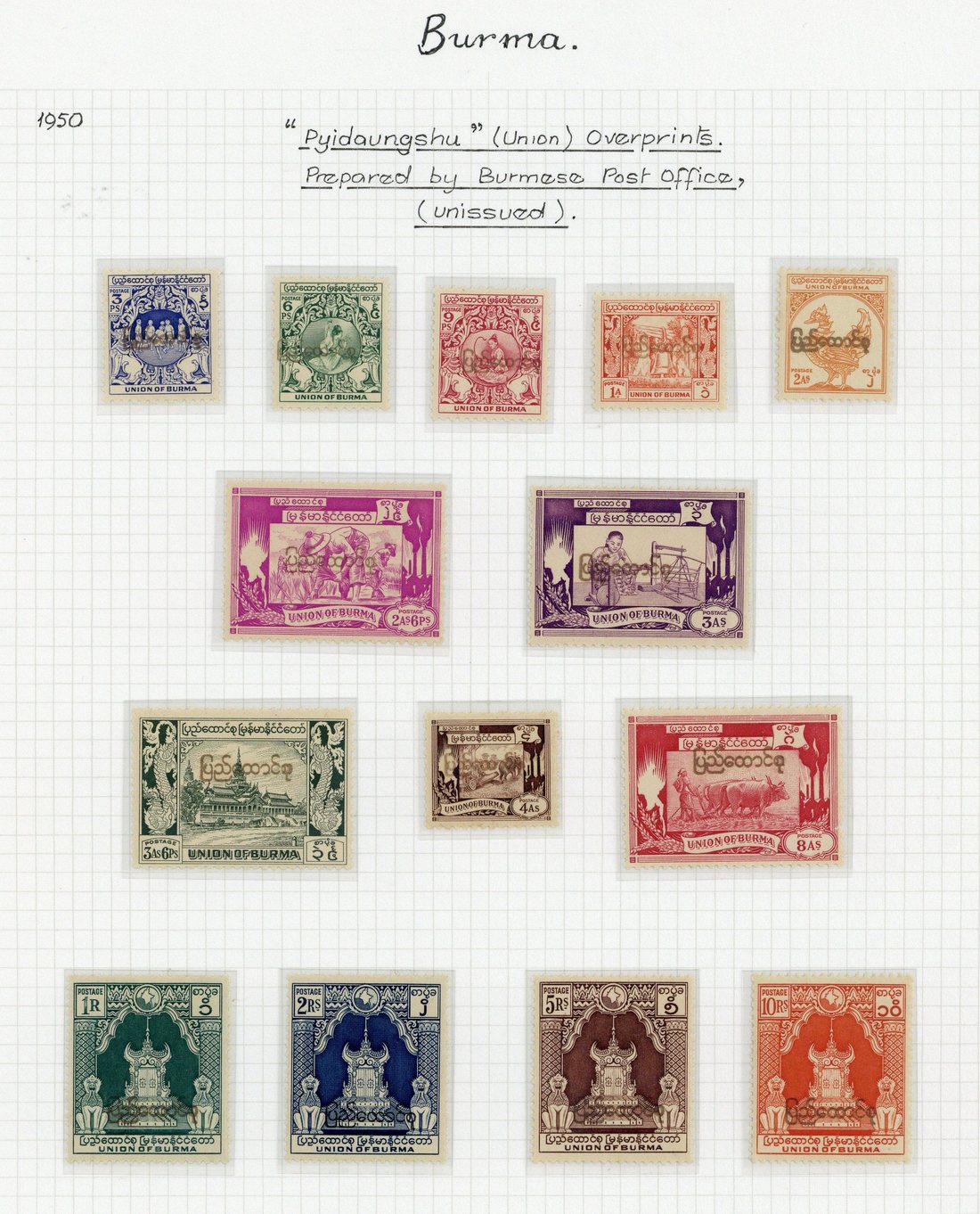 1950 "Pyidaungshu" (Union) overprints, 3p. to 10r. set of fourteen each with a single line overprint in gold or black, fine mint. A scarce unissued set