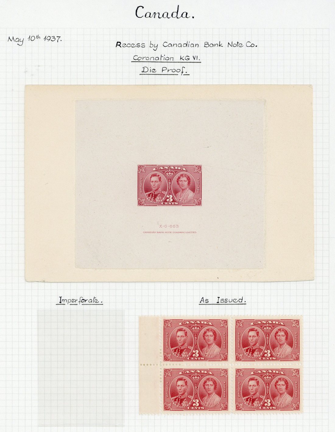 3c. carmine die proof with die number and imprint, affixed to card (151x104mm.), and issued 3c. mint block of four