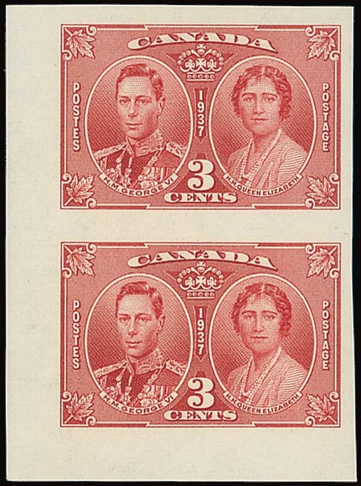 3c. carmine lower left corner vertical pair, variety imperforate, mint. Cat. £900. Also 3c. American Bank Note Co. photo essay in close to the issued design, affixed to piece marked "0877 3/3/37". Photo