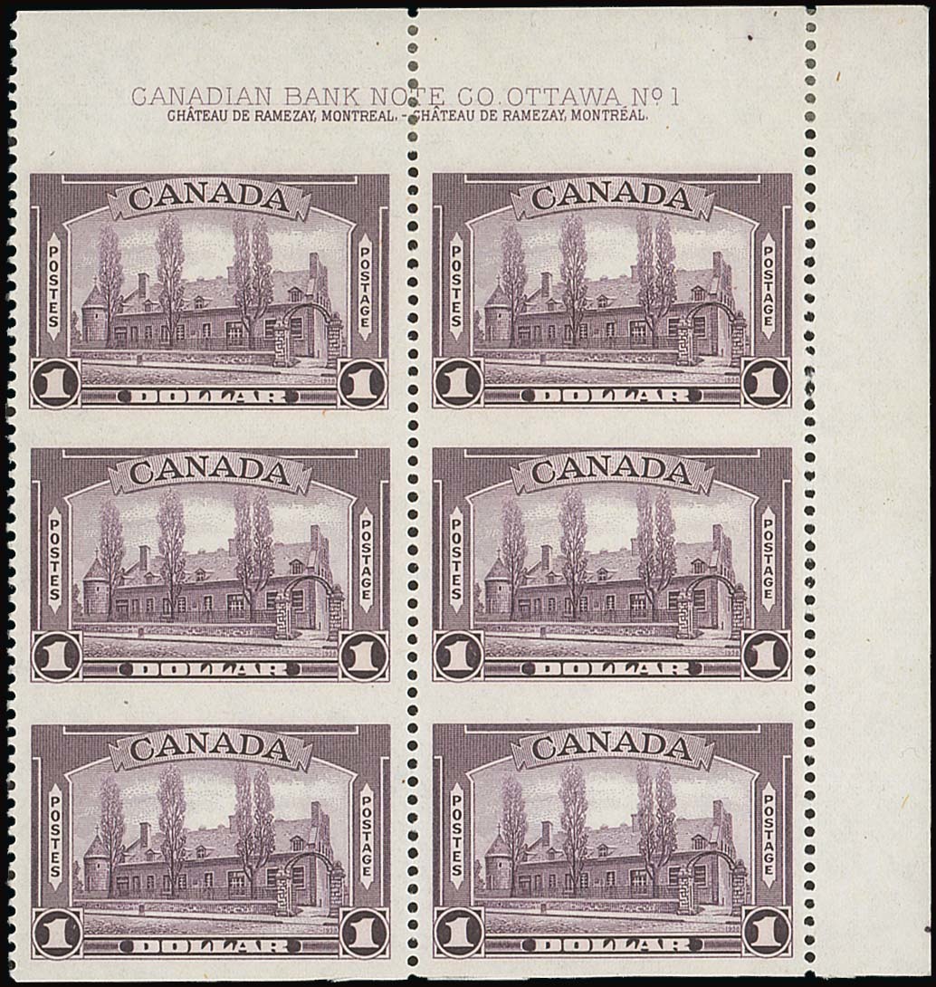 $1 violet upper right corner plate number/imprint block of six (2x3), variety imperforate horizontally resulting from being "cut incorrectly", fresh mint and mounted in top margin and lower pair. The unique multiple from the one sheet of fifty that existed. Philatelic Foundation Certificate (1968). S.G. 367, £15,000+. Photo