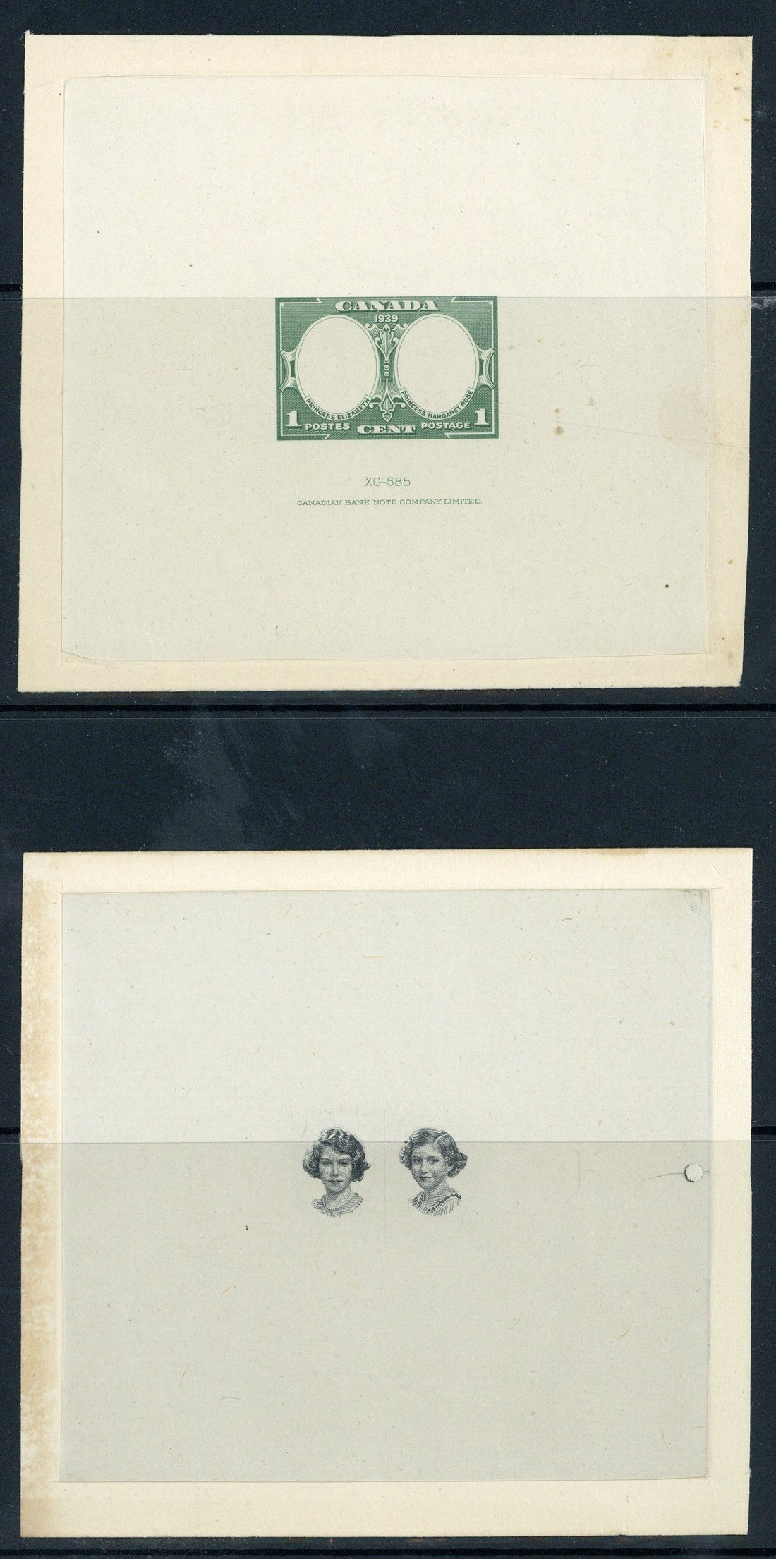1c. frame with die number and imprint and affixed to card (109x98mm.), and 1c. vignettes without die number or imprint, affixed to card (109x102mm.)
