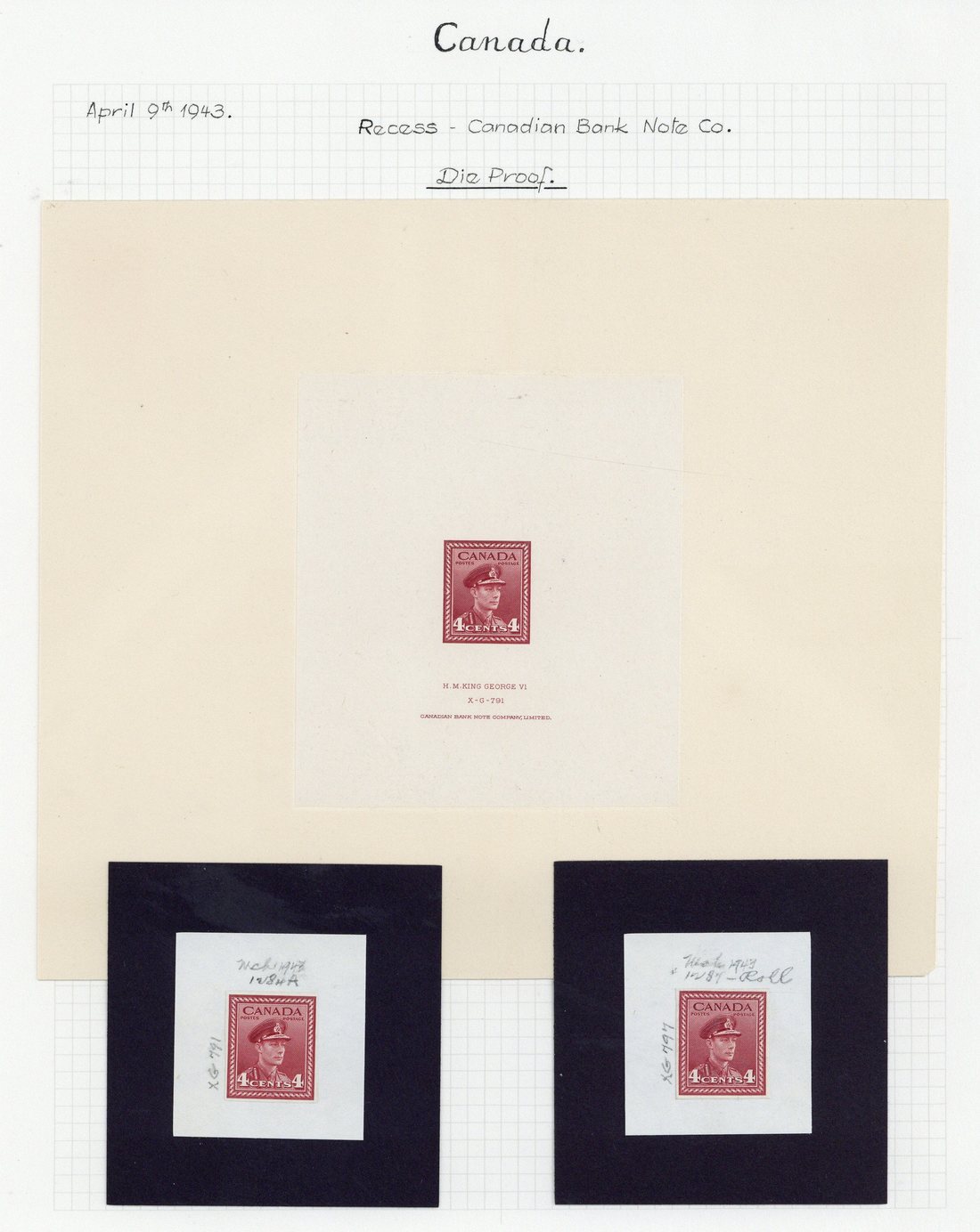 4c. carmine-lake with title, die number and imprint, affixed to card (178x154mm.); also stamp-size imperforate proofs affixed to pieces of white paper marked in pencil with die numbers (one for "rolls") and further affixed to pieces of black card (65x68mm.)