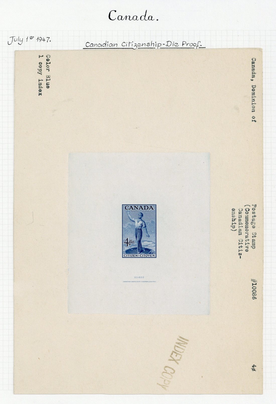 4c. blue with die number and imprint, affixed to printer's card (154x215mm.) with typed details of design, etc. and handstamped "index copy"