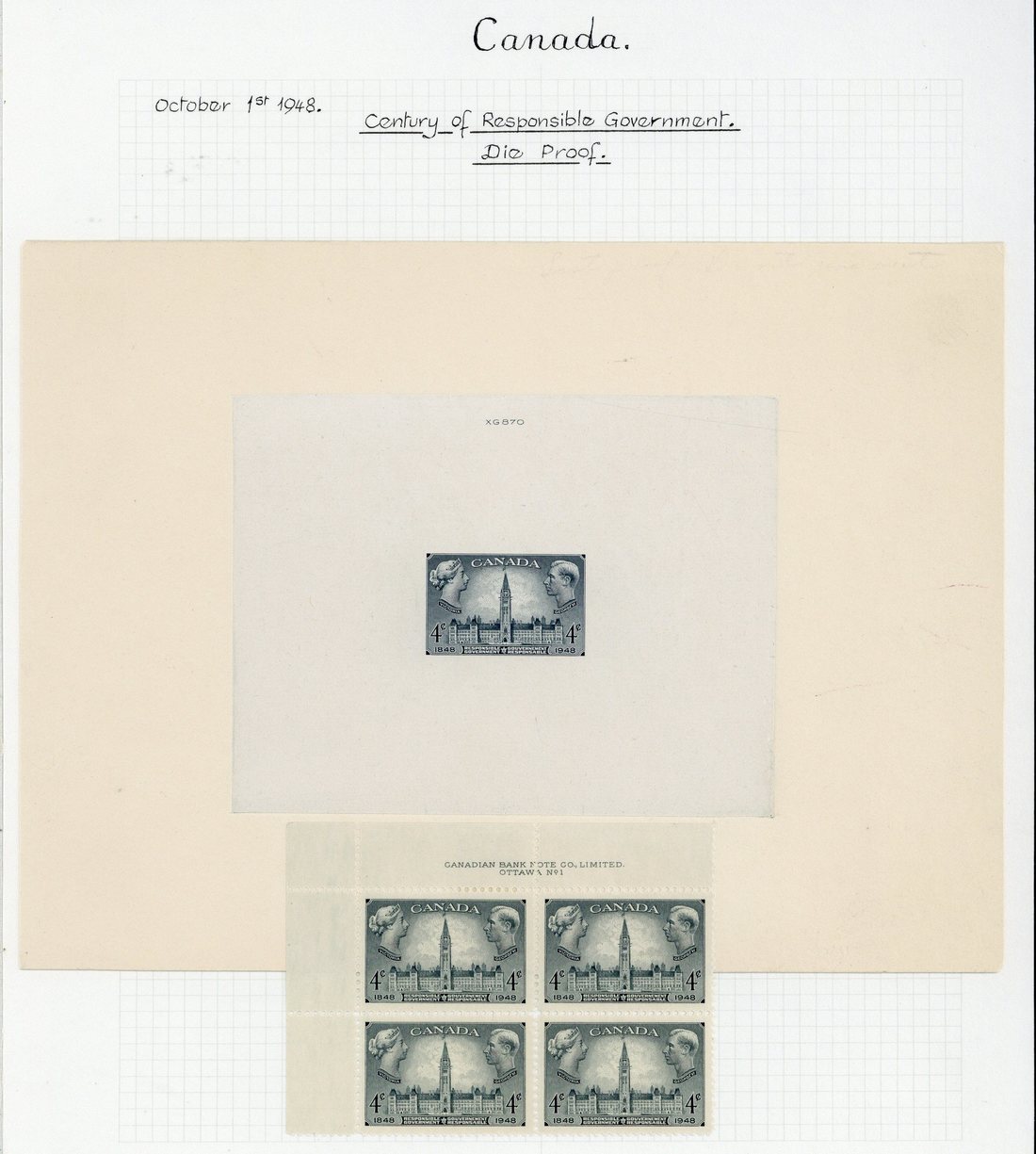 4c. grey with die number at top, affixed to card (206x153mm.), and with imprint block of the stamp; also printer's photo die proof affixed to card (211x152mm.) with typed details of the design, etc. and handstamped "index copy" at right
