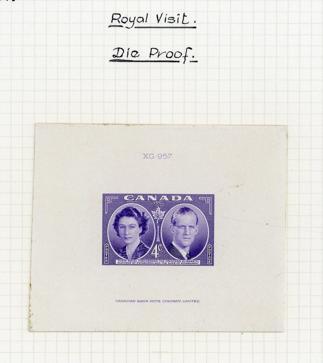 1951 Royal Visit 4c. violet die proof with die number and imprint, 74x61mm. and affixed to card of the same size