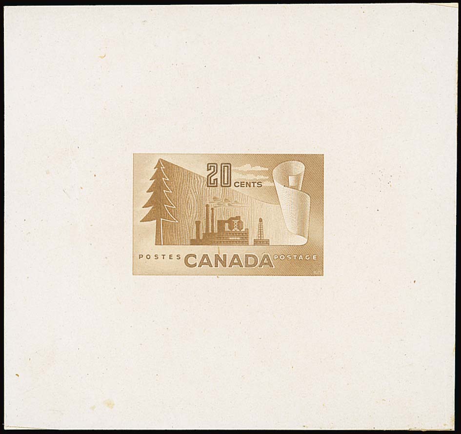 1952 Forestry Products 20c. bistre die proof , 78x74mm. and affixed to card of the same size; also American Bank Note Co. photo essay in a similar design and incorporating "1953" year date, affixed to piece marked "0993 1/14/51". Photo