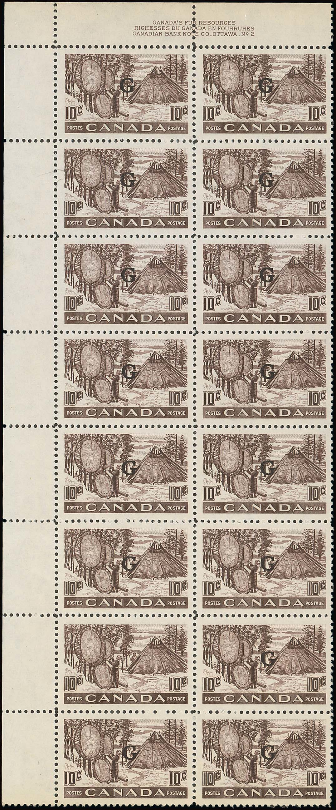 1950-51 10c. brown-purple upper left corner plate number/imprint block of sixteen (2x8), Row 7/1 variety "G" omitted in pair with normal, fresh mint and mounted in top margin only. A fine positional multiple. B.P.A. Certificate (1957). S.G. O191/a, £950+. Photo