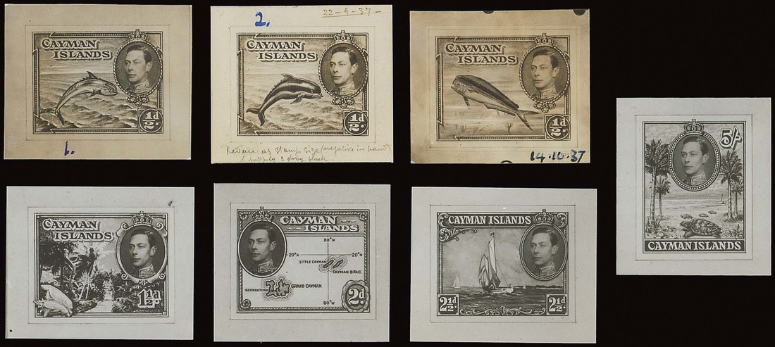 ½d. (3) of "leaping Dolphin", two in unissued design, 1½d. and 2d. unissued designs, 2½d. with different frame and 5/- (used for 10/-) photographic essays. Photo