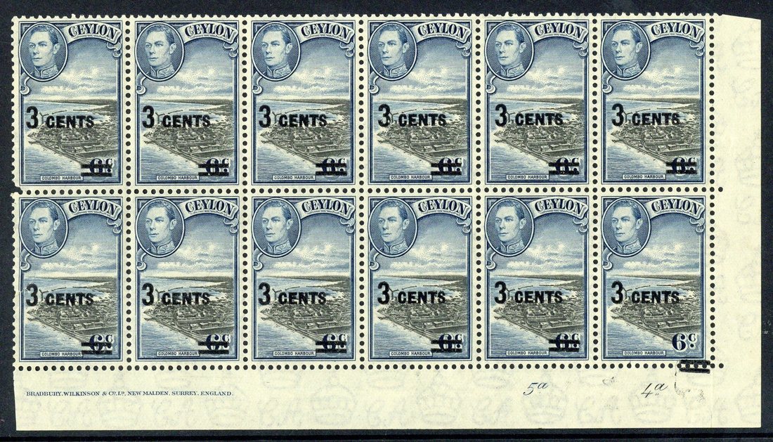 1941 "3 cents" on 6c. black and blue lower right corner block of twelve (6x2) with imprint and plate number, the lower right corner stamp showing dropped surcharge, fine mint. S.G. 398