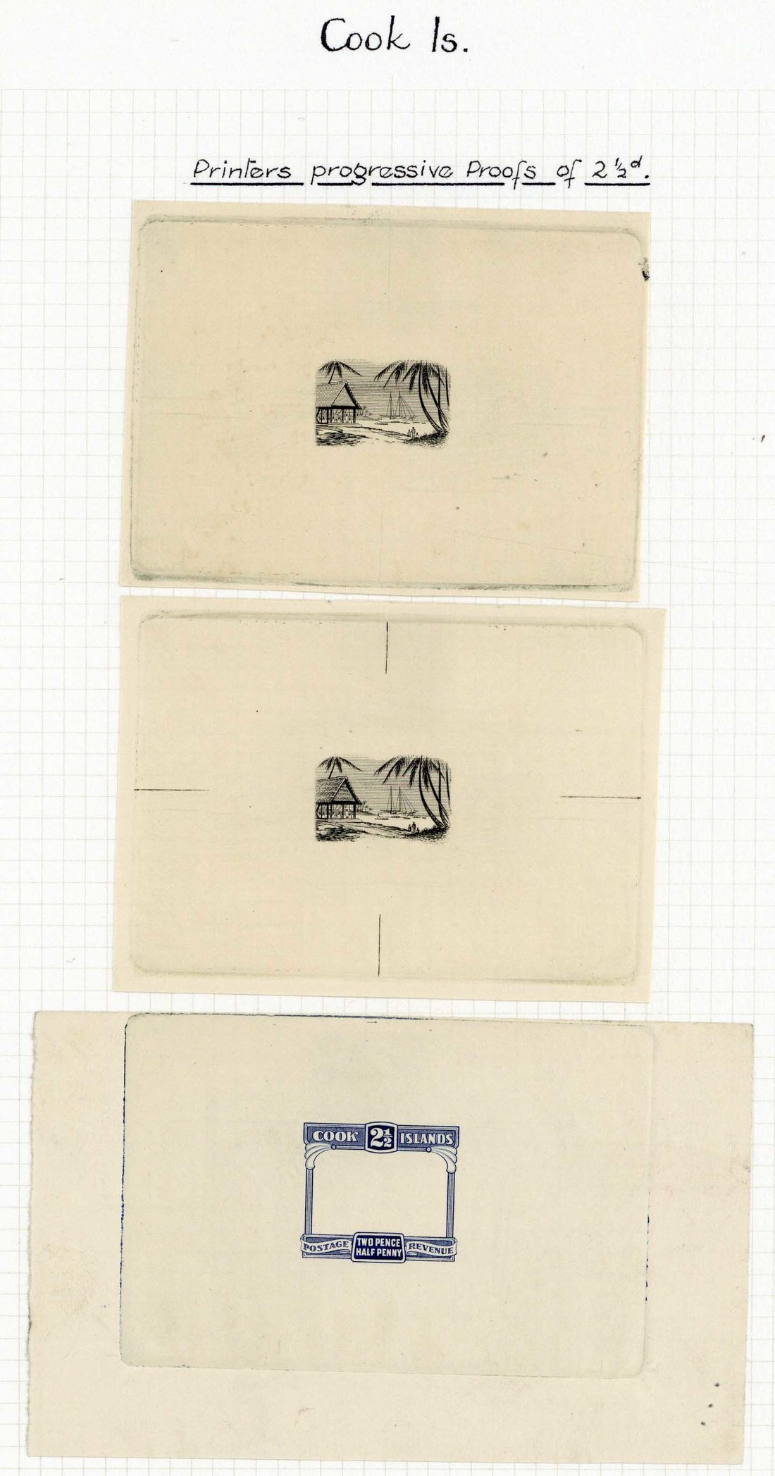 2½d. die proof of the frame in deep blue, progressive die proofs of the frame in black (2, one with guide lines) and a die proof of the complete design in black and deep blue showing guide lines, all on wove paper of various sizes, fine