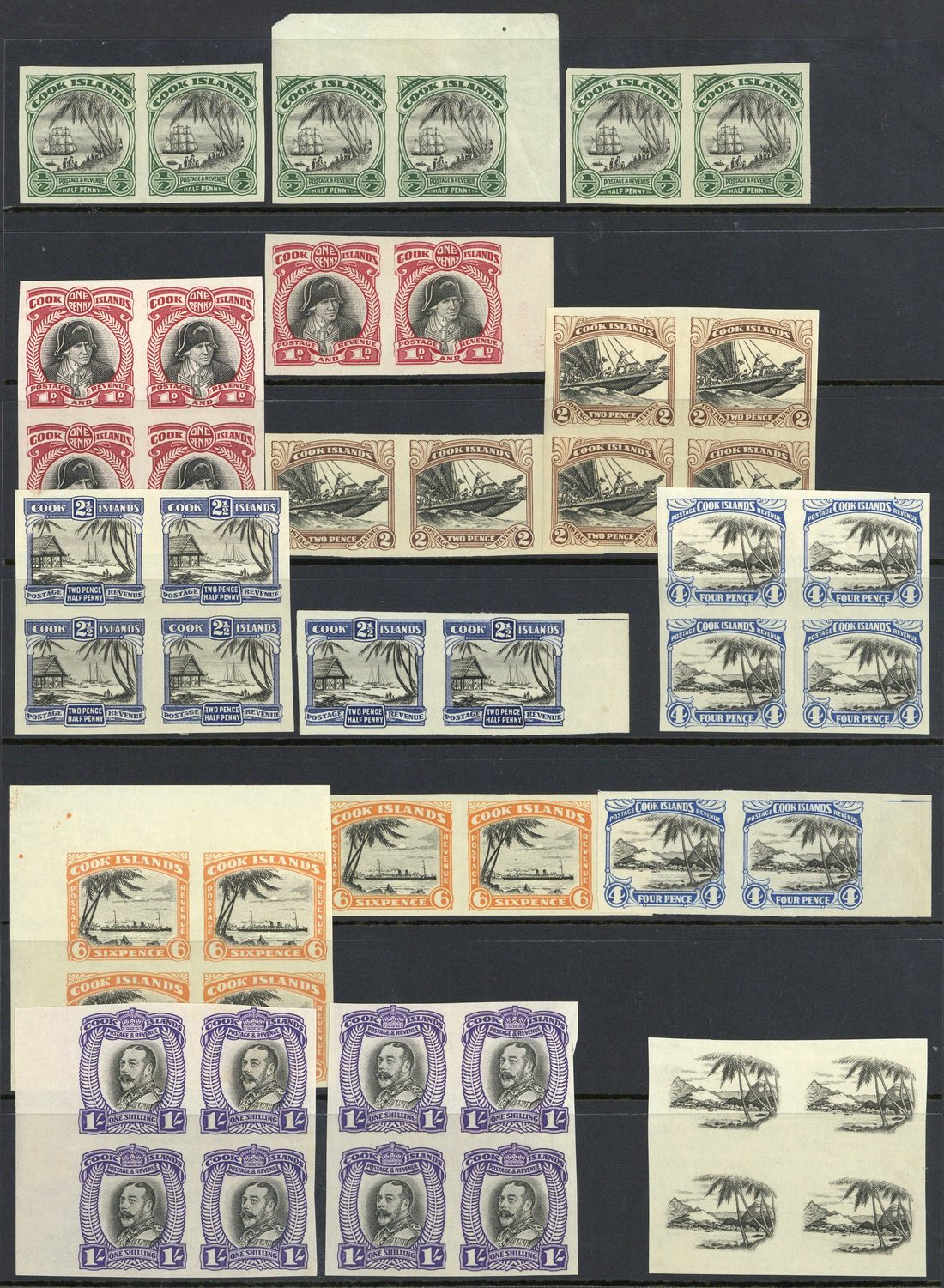 ½d. pairs (2) and 1d. to 1/- in blocks of four (gummed) and ½d. to 1/- in pairs (ungummed) plus a block of four (ungummed) of the 4d. vignette only in black, fine