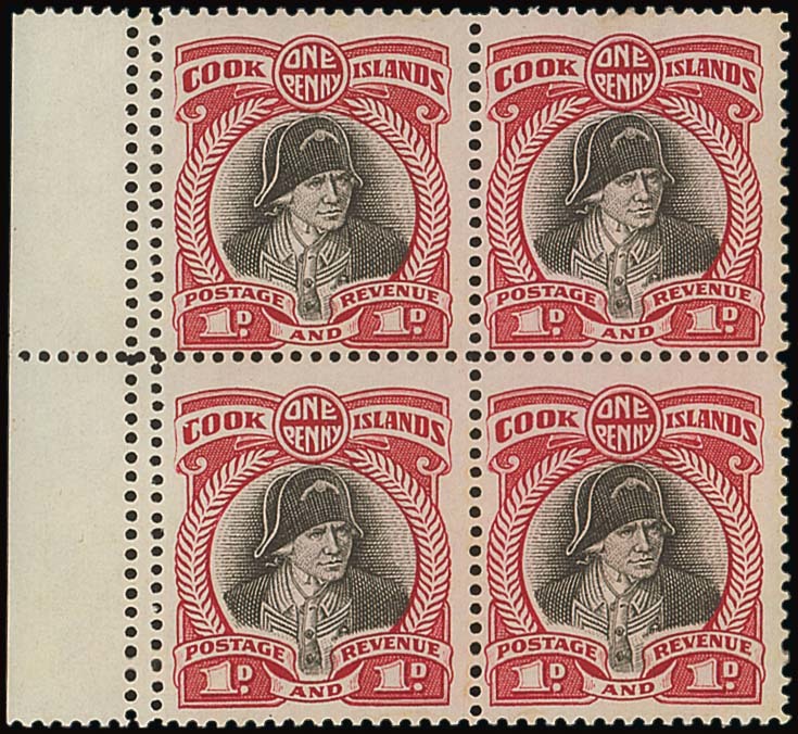 1d. black and lake, a left marginal block of four showing mixed perfs 13 and 14 at left, fine mint. R.P.S. of N.Z. Certificate (1996). S.G. 100b var. Photo