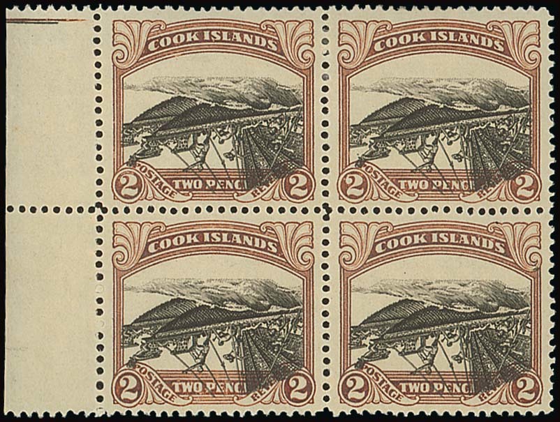 2d. black and brown, perf 13, a block of four with margin at left, variety centres inverted, fresh and fine mint. A rare multiple. Cat. £2,000. Photo
