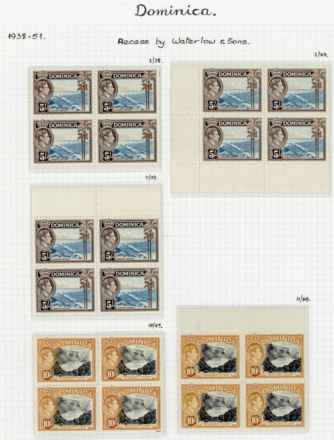 1938-47 ¼d. to 10/- in singles with some shades and ¼d. block of six, ¼d. (3), ½d. (6), 1d. (2), 1½d. (4), 2d. (3), 2½d. (7, one with retouch), 3d. (8), 3½d. (4), 6d. (3), 7d. (6), 1/- (2), 2/- (3), 2/6d. (3), 5/- (3) and 10/- (2) blocks of four and 1d. (3, one with imprint) and 7d. with imprint pairs, some with date of issue alongside, fine mint. S.G. 99-109, £1,100+