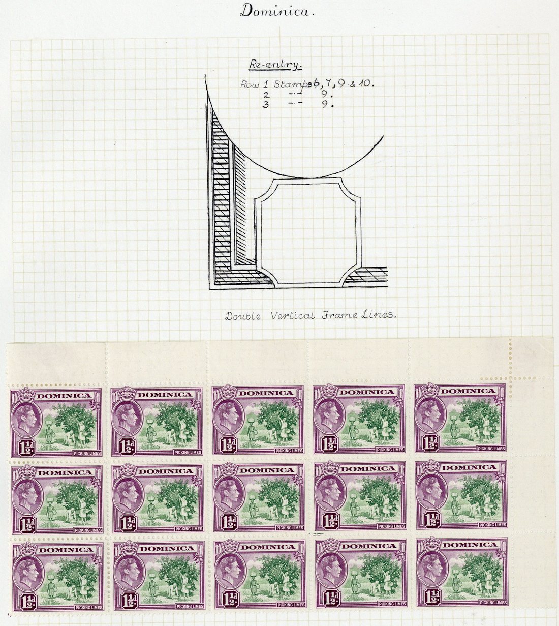 1938-47 1½d. top left corner block of fifteen (5x3) showing re-entries R. 1/6, 1/9 and 3/9, 2½d. complete sheets (3) with re-entries and an imprint block of six with re-entries R. 5/5 and 5/7, 3d. lower left corner block of six (2x3) with re-entry R. 4/2 (also a used single), 6d. top right corner block of four with re-entry R. 2/10 and a right half sheet with re-entries including R. 2/10; fine mint