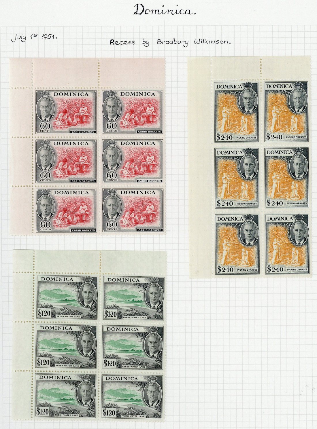1951 ½c. to $2.40 set of fifteen in corner blocks of six (¼d. with "a" of "ca" almost missing from watermark) and in singles, fine mint. S.G. 120-134, £350