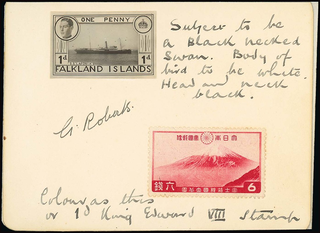 1d. photographic essay with head of King Edward VIII and vignette of S.S. "Lafonia", affixed to card endorsed "Subject to be a Black necked Swan. Body of bird to be white. Head and neck black", signed by the artist G. Roberts and bearing Japan 6s. carmine with further endorsement "Colour as this or 1d. King Edward VIII stamp", fine. Photo