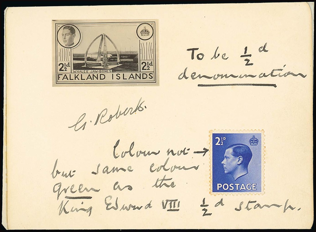 2½d. photographic essay with the head of King Edward VIII and vignette of Whale's jawbones, affixed to card endorsed "To be ½d. denomination", signed by the artist G. Roberts and bearing G.B. 2½d. blue with a further endorsement "Colour not but same colour green as the King Edward VIII ½d. stamp", fine; also the original photograph as used and accepted for the ½d. stamp. Photo