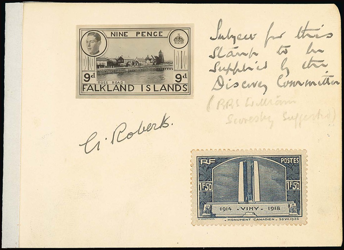 9d. photographic essay with the head of King Edward VIII and vignette of Ross Road, affixed to card endorsed "Subject for this stamp to be supplied by the Discovery Committee" and in pencil below "(RRS William Scoresby suggested)", signed by the artist G. Roberts and bearing France 1f.50 grey-blue as a colour standard, fine. Photo