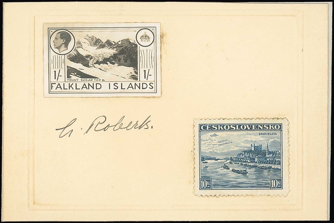 1/- photographic essay with the head of King Edward VIII and vignette as issued, affixed to card signed by the artist G. Roberts and bearing Czechoslovakia 10k. dull blue as a colour standard, fine. Photo