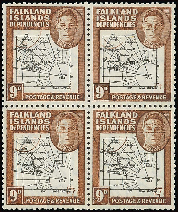 9d. black and brown, a block of four showing variety double print of frame, fine unused without gum. With normal block for comparison. S.G. G7 var. Photo