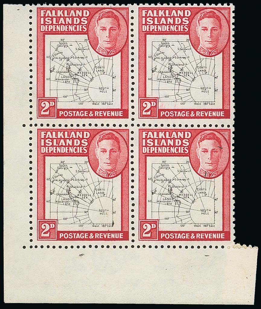 2d. black and carmine, a lower left corner block of four, variety map printed double, fine unmounted mint. A rare multiple. R.P.S. Certificate (1981). Heijtz cat. £4,800. Photo