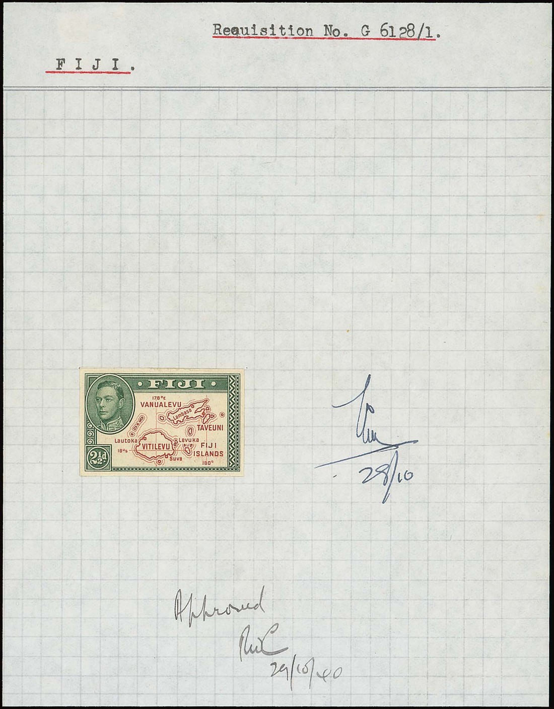 2½d. brown and green, Die II, stamp-size proof affixed to piece (125x160mm.) headed "fiji Requisition No G 6128/1", initialled and dated "28/10" alongside, the proof endorsed "Approved", initialled and dated "29/10/40" at foot, fine. Ex De La Rue archives. Photo