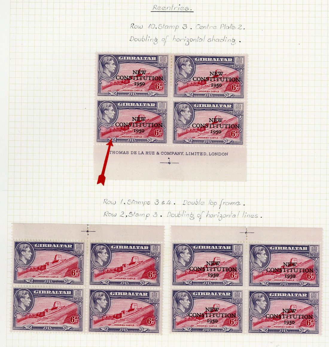 1938-51 3d., 6d. marginal block of four 1/- and 5/- (margin at top), and 1950 New Constitution 6d. marginal blocks of four (2), all showing re-entries, 1938-51 1/- with worn vignette and 1950 New Constitution 6d. complete sheet (folded) and 1/- imprint block of four with one showing broken "R"; fine