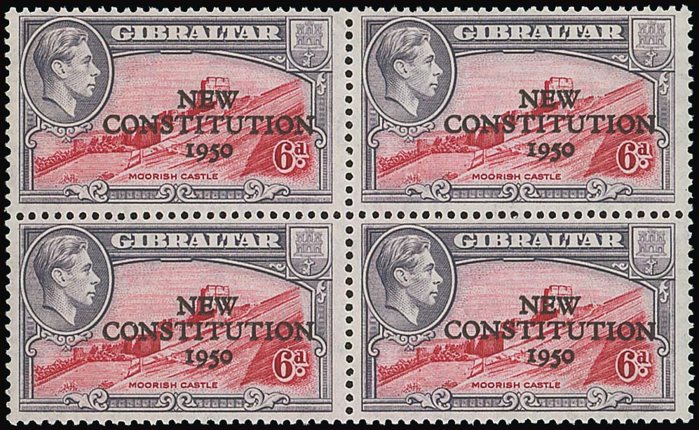1950 New Constitution 6d. carmine and grey-violet block of four, variety overprint double, fine unmounted mint. B.P.A. Certificate (1956). S.G. 142a, £4,000. Photo