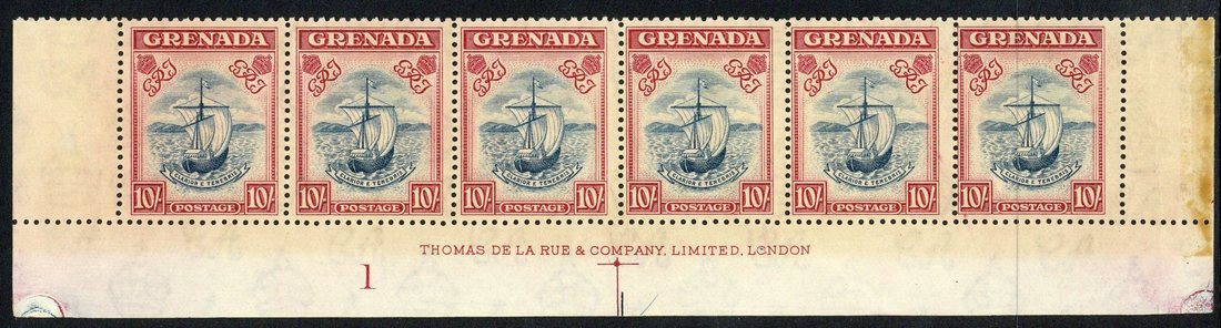 1938-50 narrow frame, perf 12x13, 10/- steel-blue and carmine, a marginal horizontal strip of six from the foot of the sheet with imprint and plate number showing the usual browned gum, fine unmounted mint. S.G. 163, £360