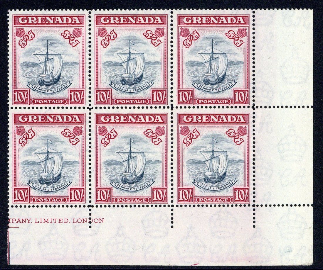 1938-50 wide frame, perf 14, 10/- slate-blue and carmine-lake, a lower right corner block of six (3x2) with part imprint, fresh and fine unmounted mint. S.G. 163d, £840