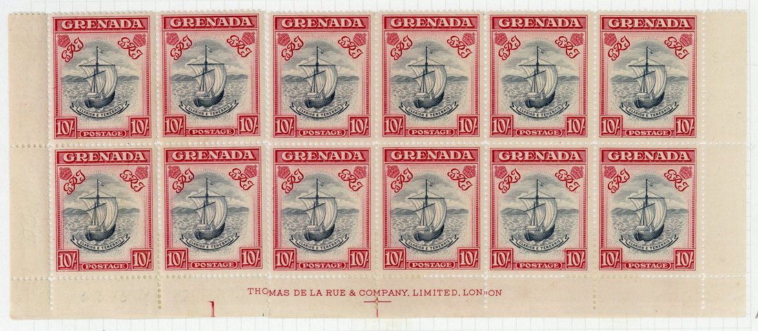 1938-50 narrow frame, perf 14, 10/- blue-black and carmine marginal blocks of eighteen (6x3), eight with imprint/plate number and four (3 reconstructing the bottom two rows of the sheet), slightly differing shades, fine mint. S.G. 163e group, £1,824