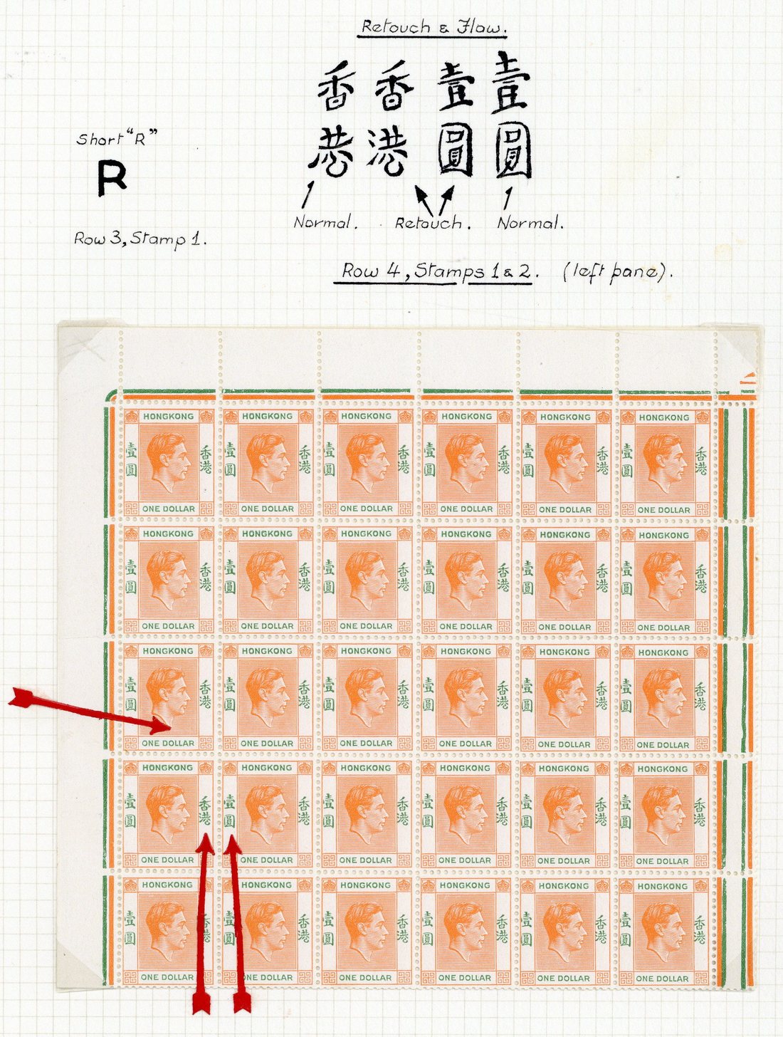 $1 red-orange and green, a complete left pane (folded), one showing short right leg to "r", one with "arrow" indicator affixed, fresh unmounted mint. S.G. 156/a, £1,800+